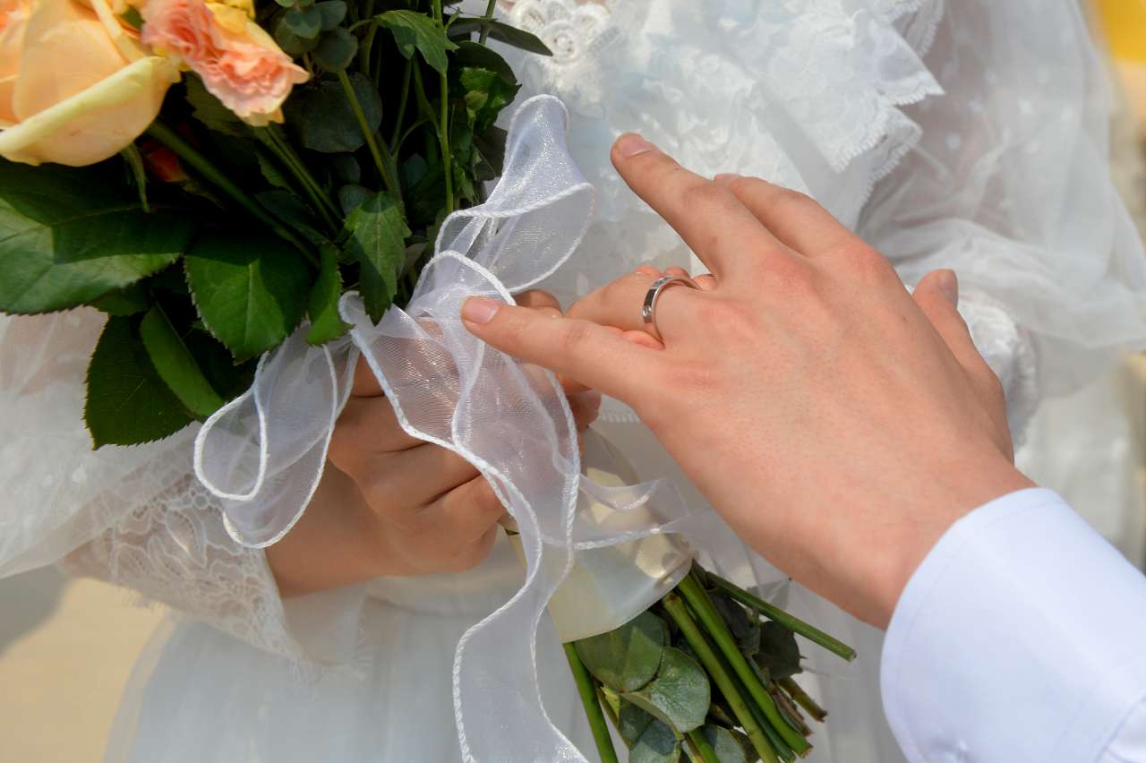 6月8日,在山东省青岛市市北区青岛滨海国际中心文明实践广场举行的集体婚礼活动上,新人互带象征“以物寄情,情定终生”的钻戒。