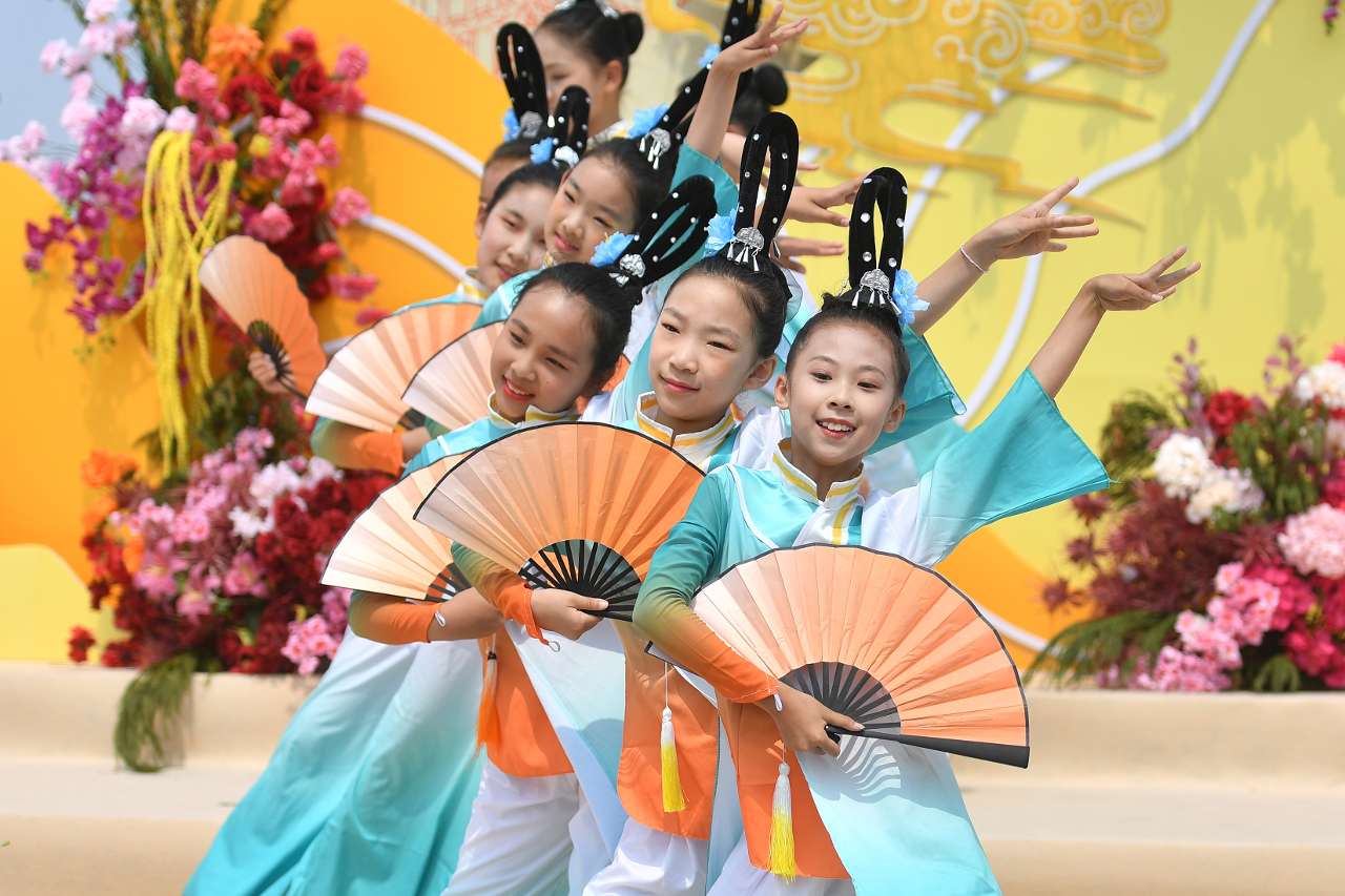 6月8日,在山东省青岛市市北区青岛滨海国际中心文明实践广场举行的集体婚礼活动上,小朋友们为新人表演祝福舞蹈。