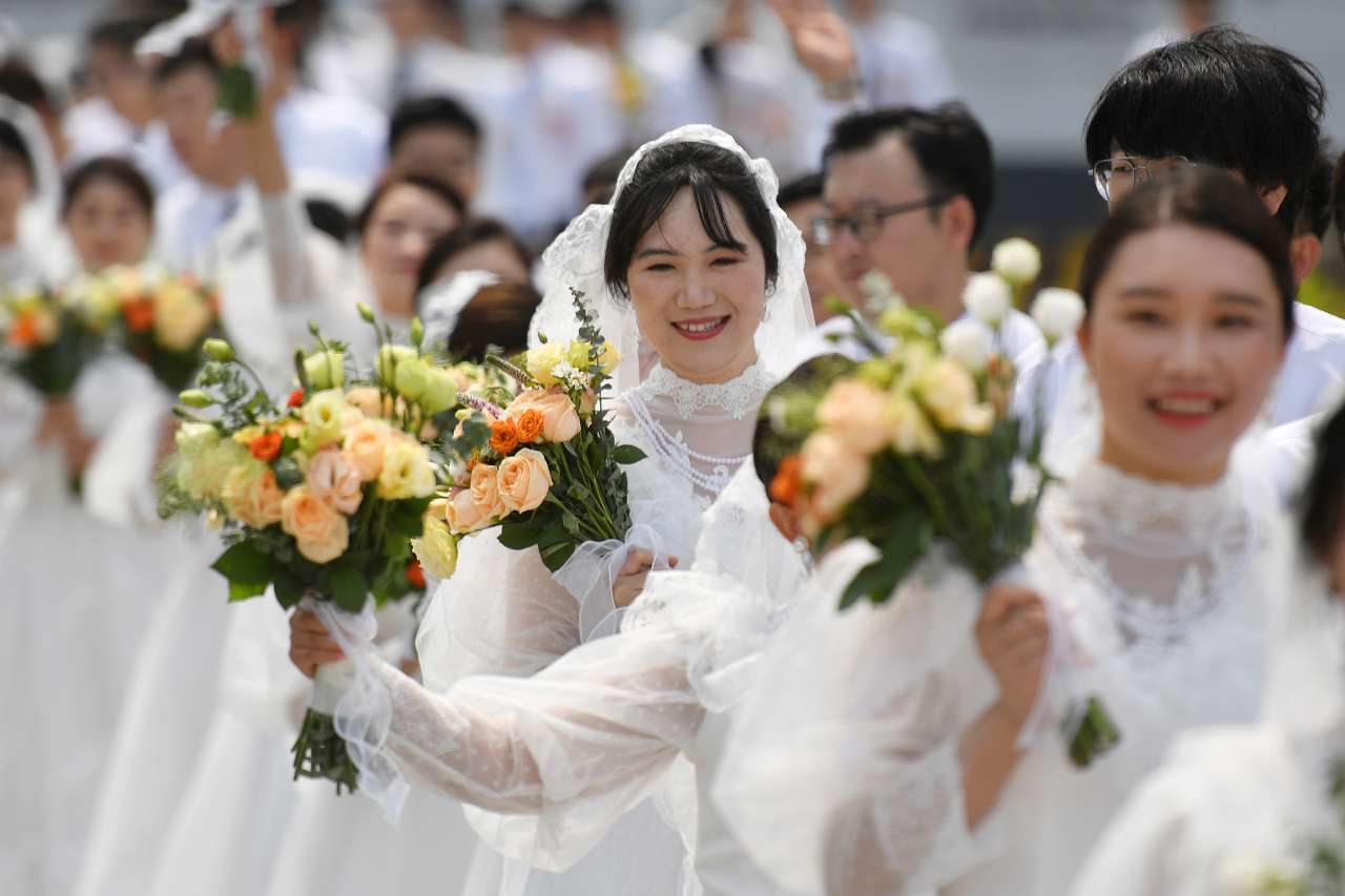 6月8日,在山东省青岛市市北区青岛滨海国际中心文明实践广场举行的集体婚礼活动上,新人们手捧鲜花步入婚礼殿堂。