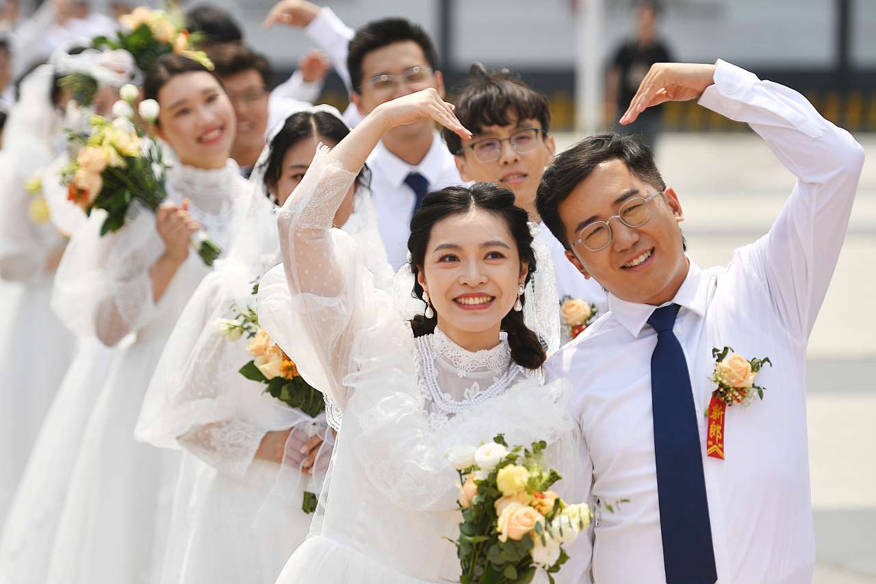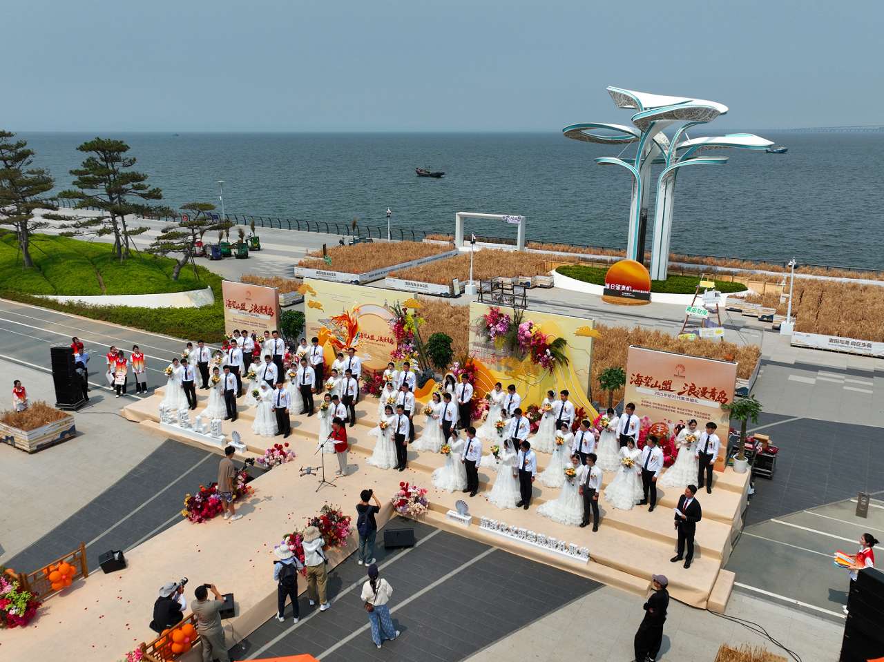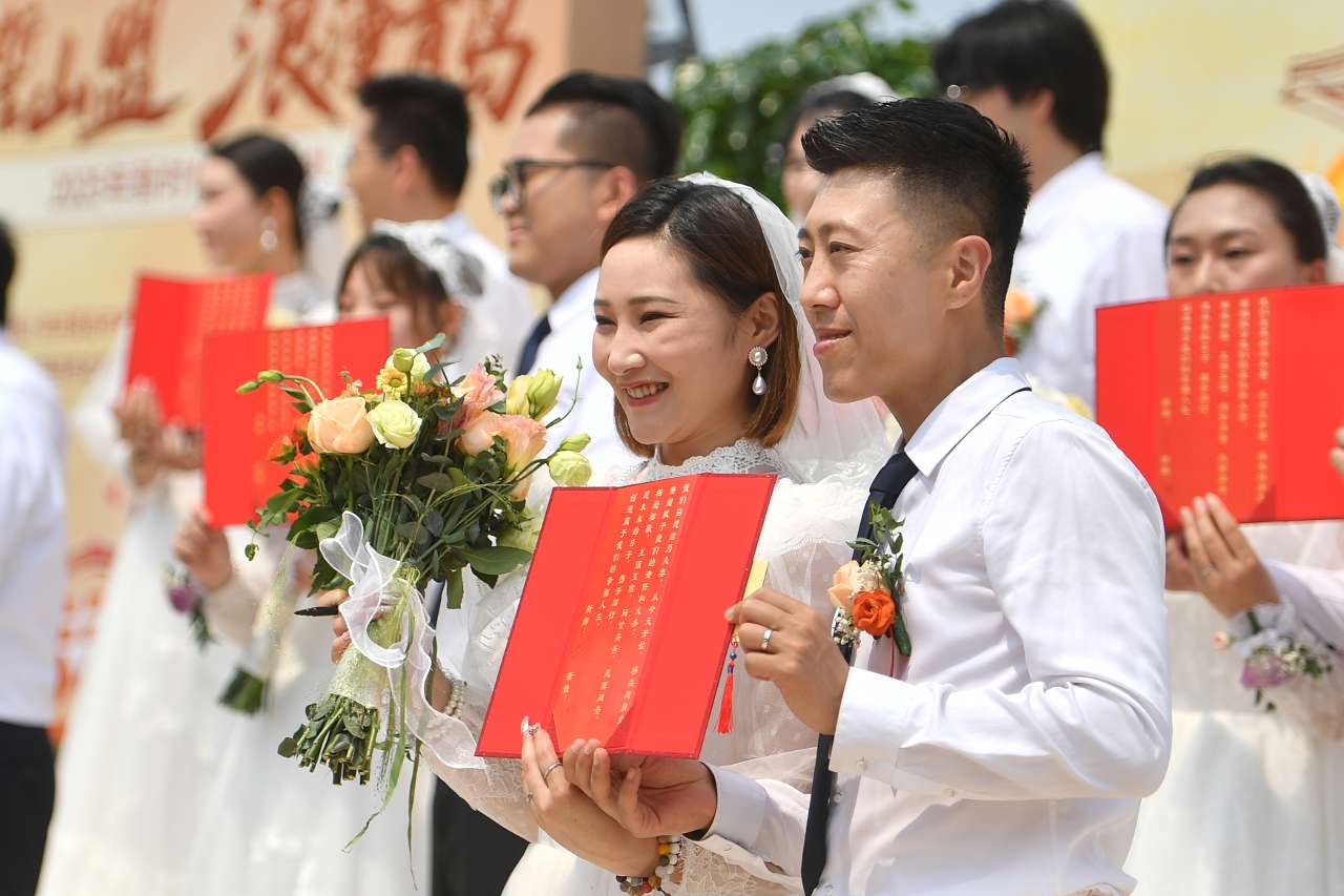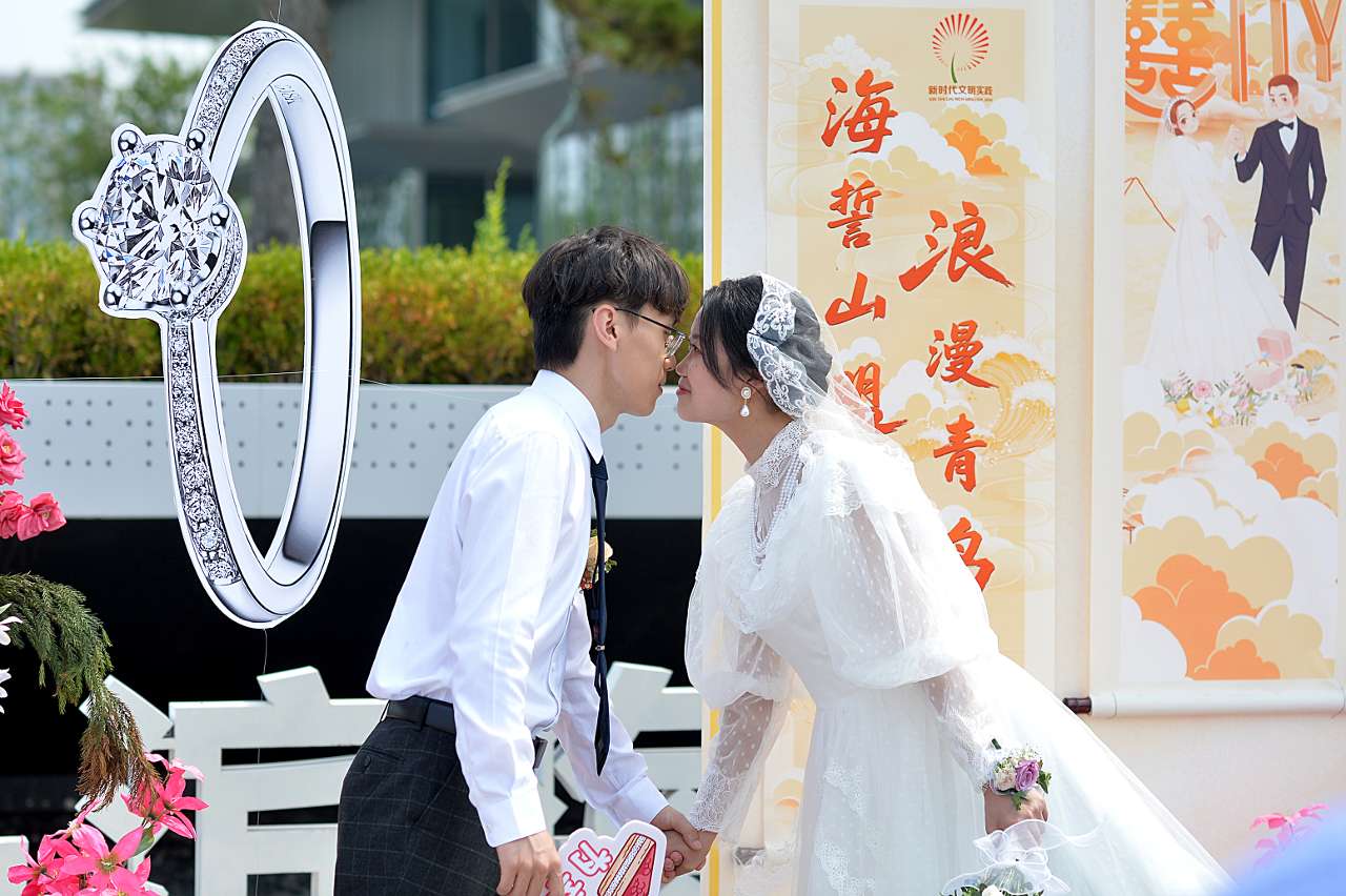 6月8日,山东省青岛市委宣传部等部门在青岛滨海国际中心文明实践广场,为来自教育、金融、科技等不同行业的28对新人举行新时代集体婚礼。新人们在亲友的见证下交换信物、签订婚书,完成一场简约而时尚的集体婚礼。