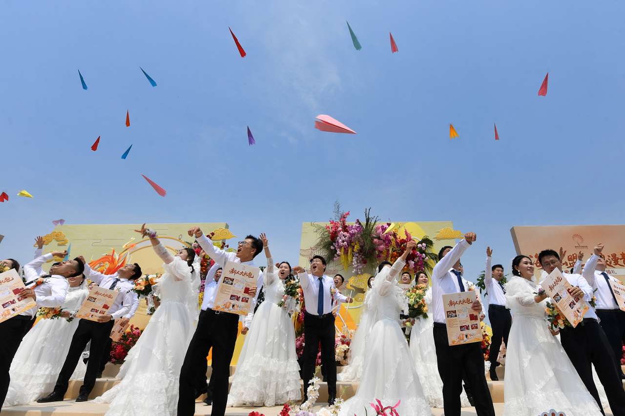 6月8日,在山东省青岛市市北区青岛滨海国际中心文明实践广场举行的集体婚礼活动上,新人放飞象征梦想启程的纸飞机。